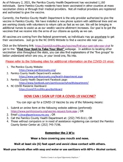 PAMLICO COUNTY HEALTH DEPARTMENT PRESS RELEASE FEBRUARY 3, 2021